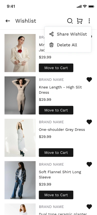 Save favorites instantly from product cards and detail pages.