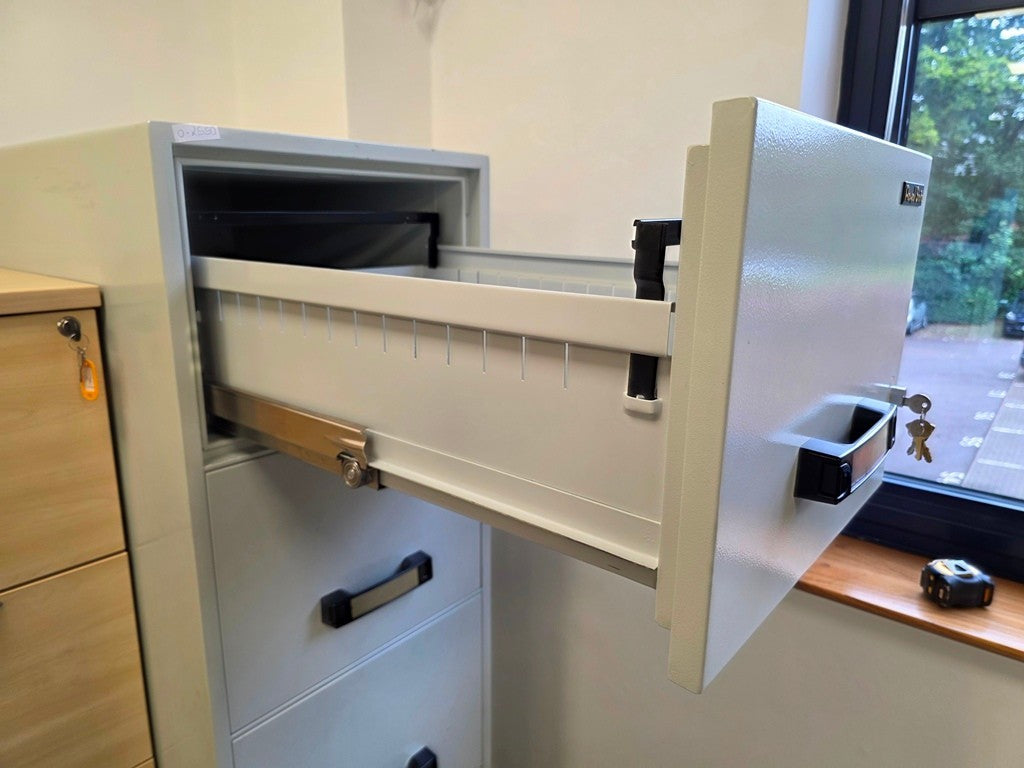 Professional steel fireproof filing cabinet designed for secure, long-term document storage in offices and home workspaces. Supports both A4 and foolscap suspension files for flexible filing.